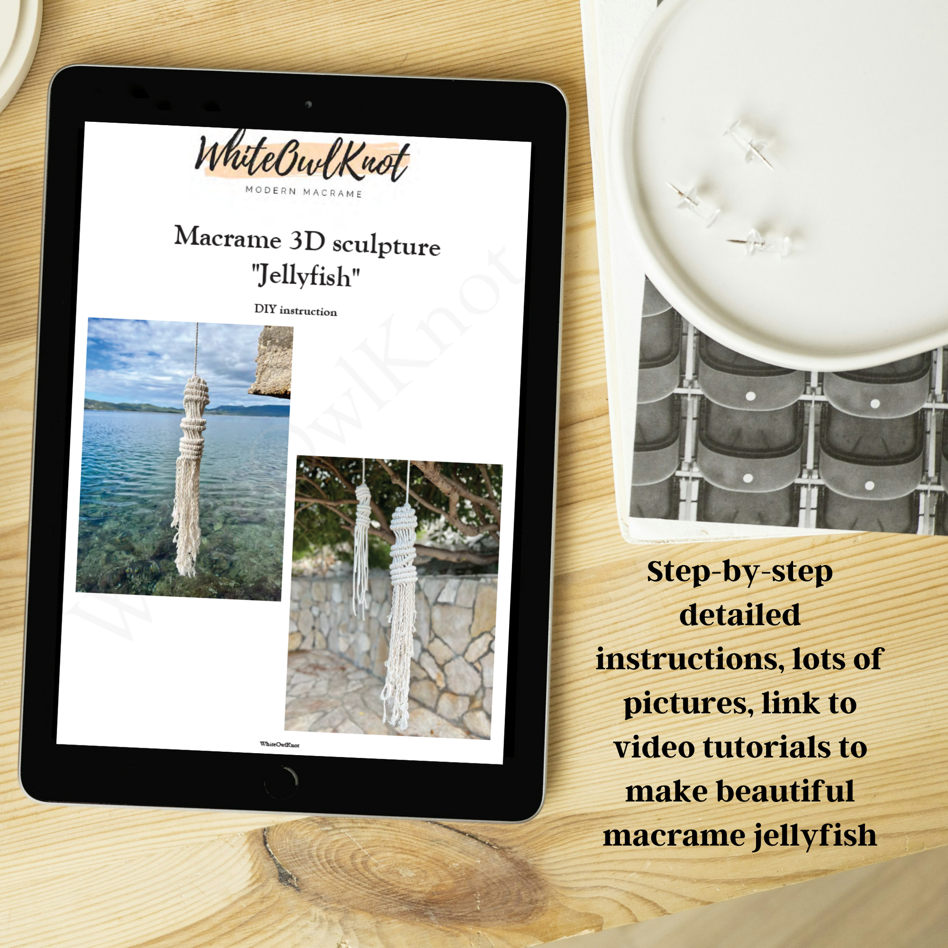 This Listing is for the Macramé Pattern to make 3D Ocean Art MACRAME JELLYFISH This charming Macrame Jellyfish can decorate any room in your house: bedroom, living room, nursery or terrace - everywhere they look absolutely beautiful. Great as a decoration in a beach house, a mobile in a nursery, a wind chimes on a terrace or garden. Also looks great with garlands.
