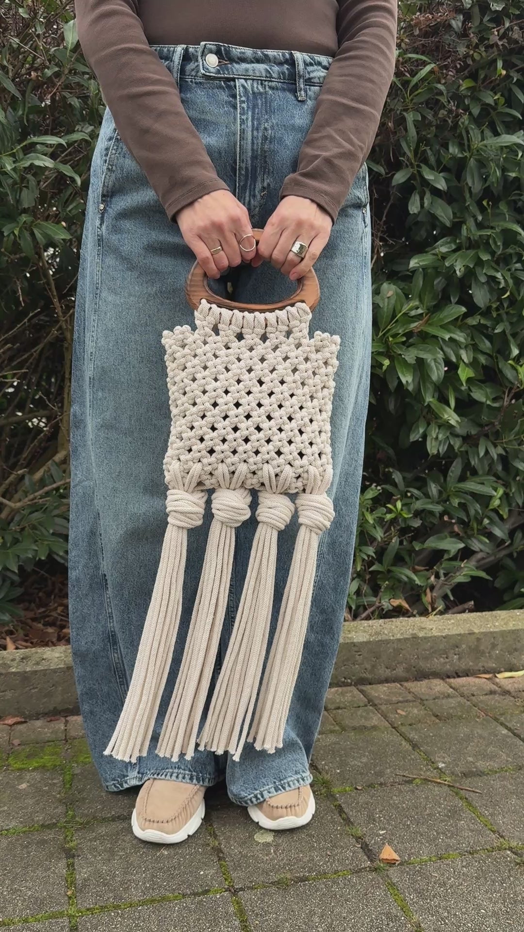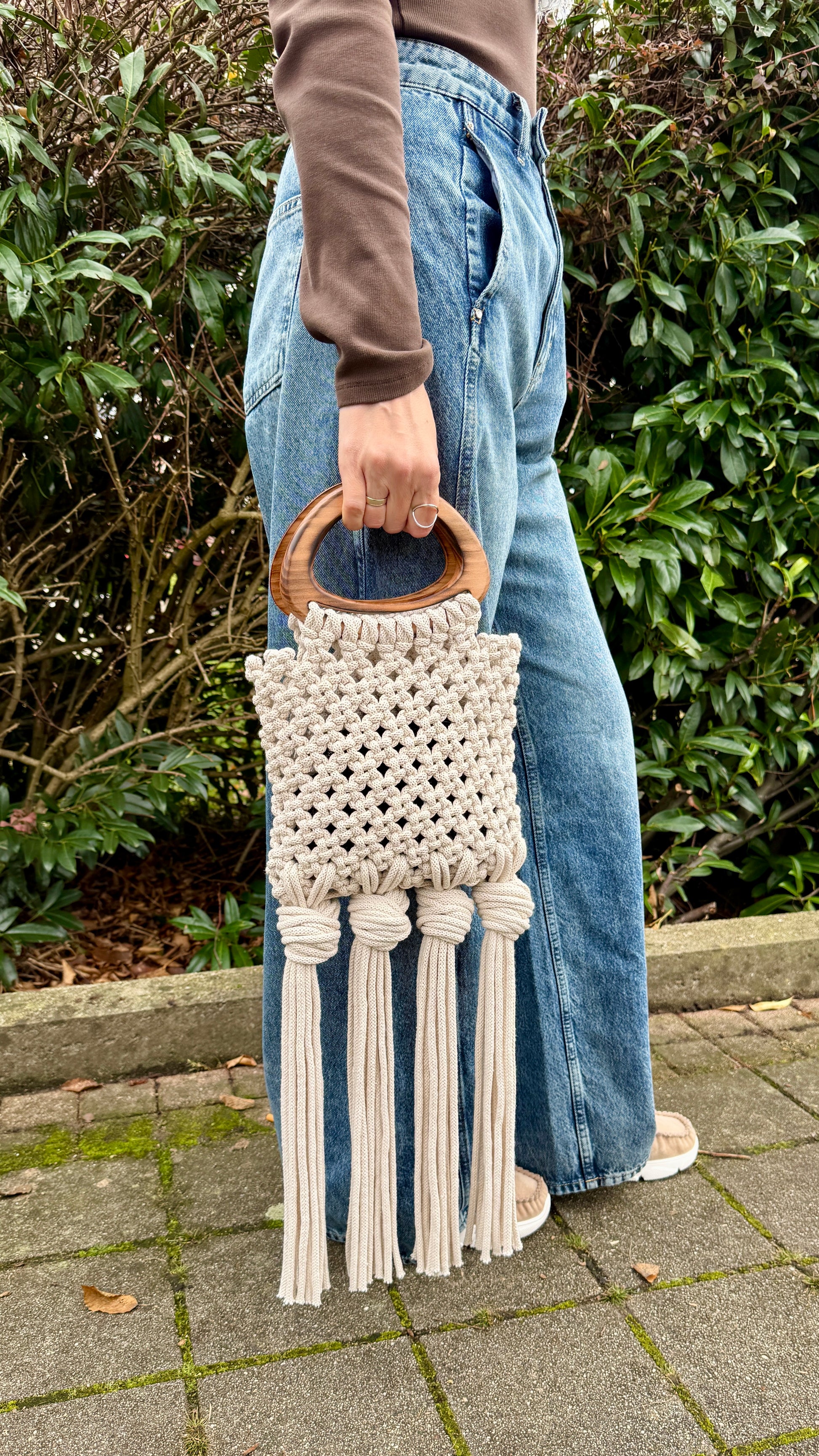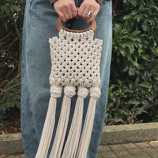 A great accessory for a stylish fashion look, this macramé handbag adds texture, elegance, and a handcrafted touch to any outfit.