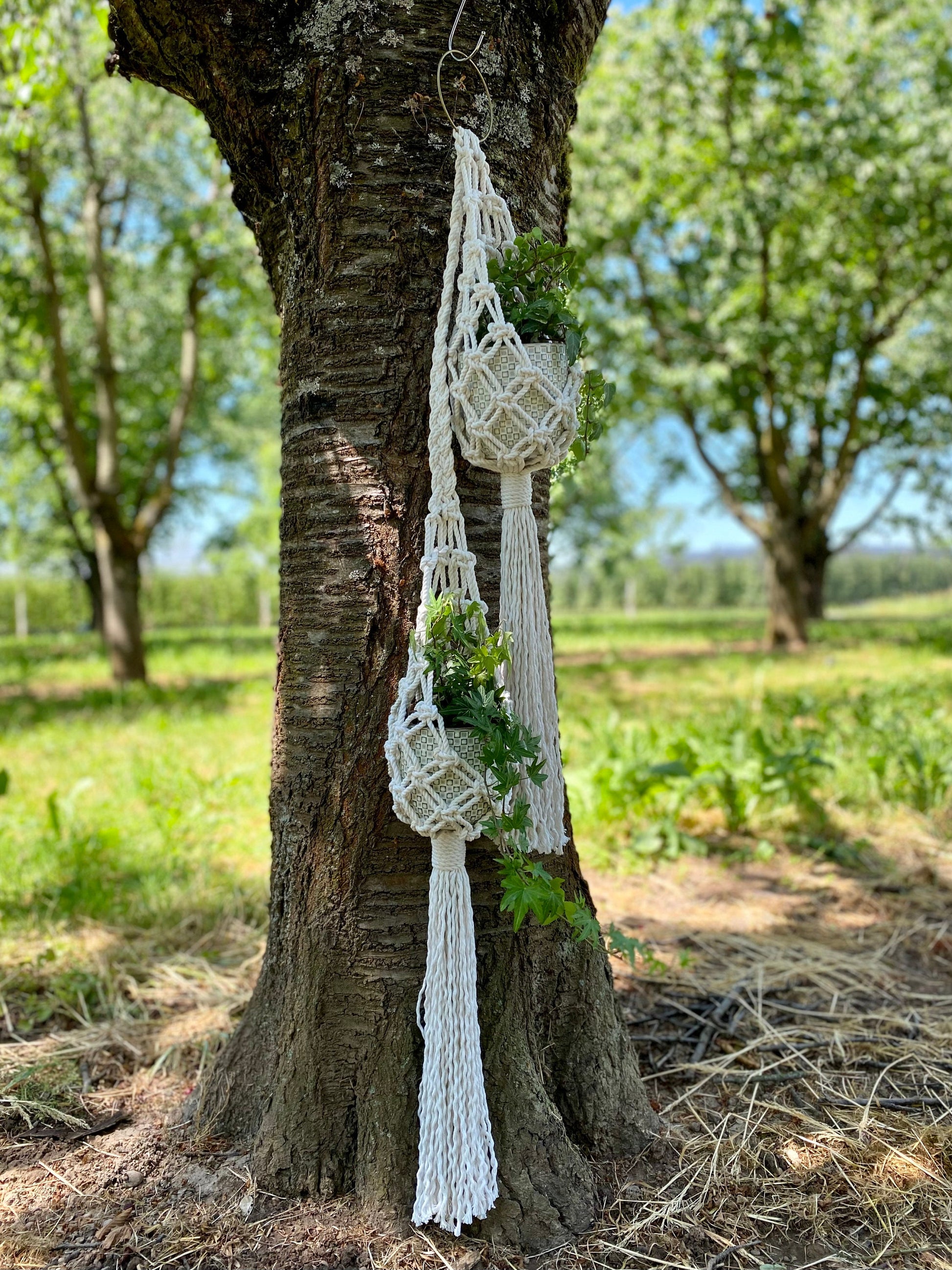 You can expect the Macrame Plant Hanger to hang approximately 140cm long incl. 40cm tails *measured without pots inside. Keep in mind that the hanging planter shrinks up a little when the pot is inserted depending on the size of your pot. Suitable for pots with a diameter of approx. 15cm. Same macrame pattern for small pots you can find here: small pots planter.