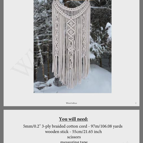 You will get: PDF Pattern with many explicit pictures and very detailed instruction to help keep you right. If you are very beginner in macrame you can watch my video tutorial with all the knots you need to create this awesome macrame on my YouTube channel Whiteowlknot Macrame: https://bit.ly/3pWVPsA